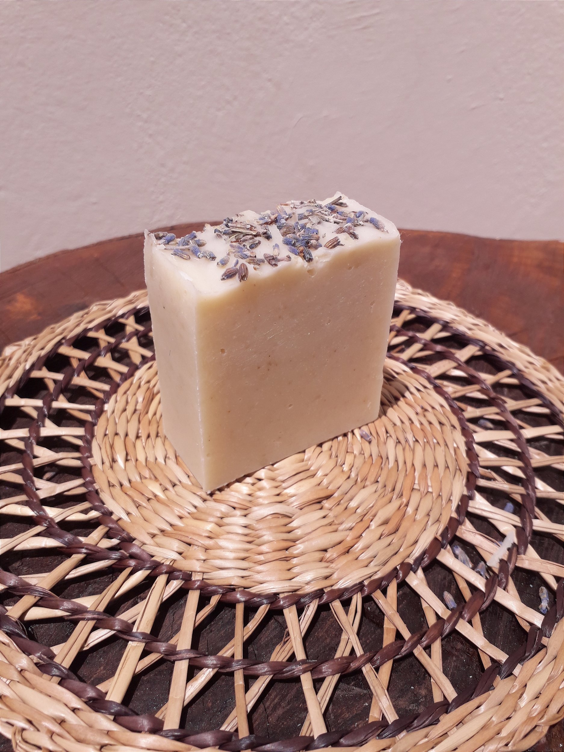 Sabonete feito com óleos vegetais, leite de aveia e aroma de lavanda.
